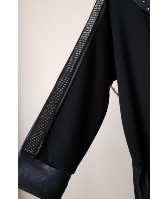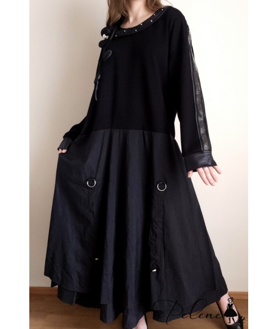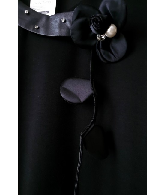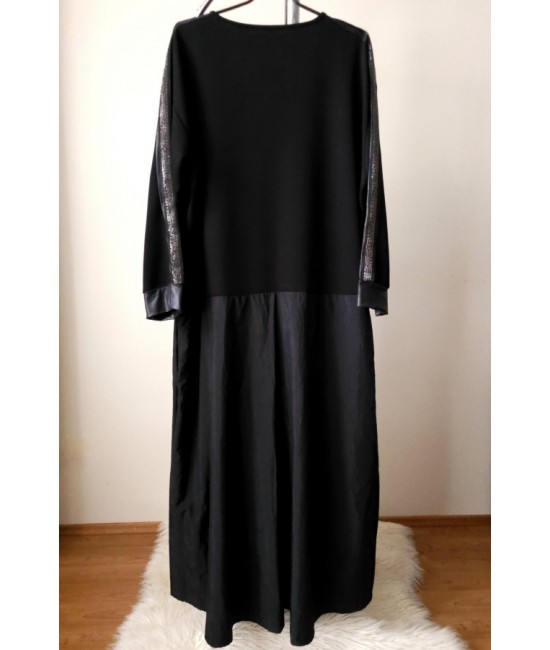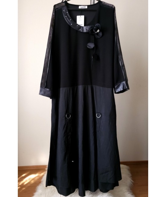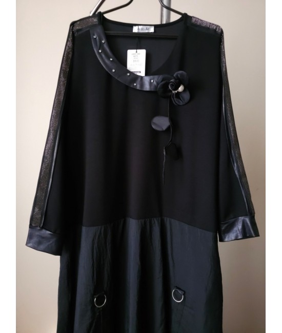 Nauja, stilinga ir labai įdomi turkiška suknelė, išsiskirianti unikaliu dizainu ir subtiliomis detalėmis. Viršutinė dalis pasiūta iš storesnio trikotažo, o apatinė – iš lengvos taftos, kuri suteikia gražią formą ir lengvą kritimą. Suknelės sijono dalis reguliuojama, gali būti sutraukiama, todėl lengvai keičiamas siluetas ir išvaizda. Rankovės dekoruotos subtiliu blizgesiu, o rankogaliai su eko oda suteikia modernumo ir išskirtinumo. Palei kaklą yra elegantiška dekoratyvinė gėlė su perlu, kuri tampa pagrindiniu akcentu. Modelis su elastanu yra patogus, nevaržo judesių. Suknelė su kišenėmis.