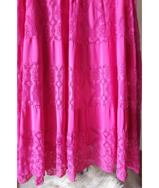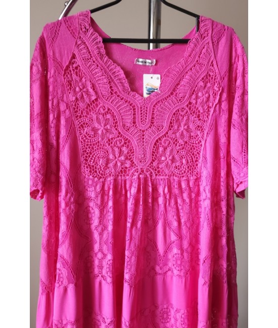Nauja, lengva ir elegantiška ažūrinė viskozinė suknelė. Gražūs nėrinių rašto elementai sukuria subtilų, romantišką įvaizdį, o laisvas siluetas leidžia jaustis patogiai visą dieną. Švelni viskozė maloniai krenta, audinys lengvas ir laidus orui, todėl suknelė puikiai tinka šiltesniam sezonui, kelionėms ar laisvalaikiui.